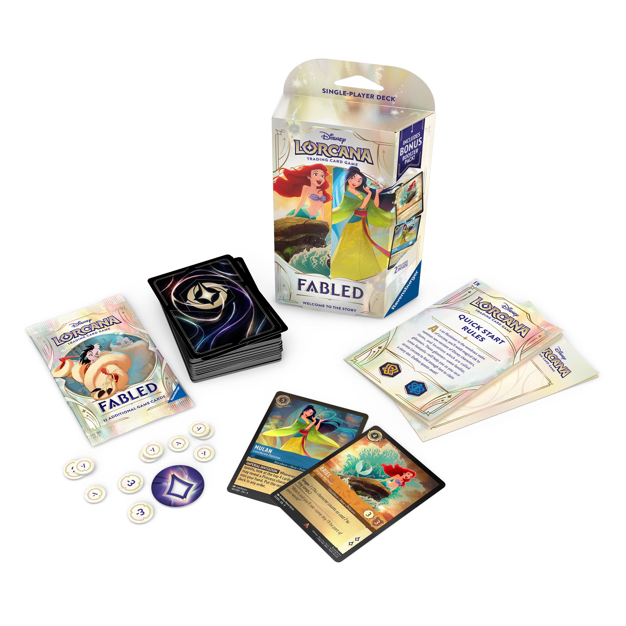 Disney Lorcana Single-Player Decks include everything you need to start playing against another player. Through these decks, you'll get a taste of the rich story and varied characters of Disney Lorcana.